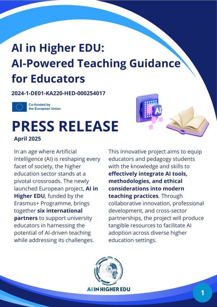 In an era where Artificial Intelligence (AI) is rapidly transforming every aspect of society, the field of education is at a crucial turning point. The new European project AI in Higher Education, funded by the Erasmus+ Programme, brings together six international partners to support university educators in embracing the opportunities and addressing the challenges of AI-powered teaching.