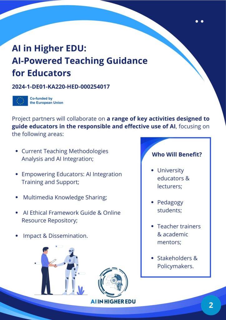 The project aims to empower educators and pedagogy students by integrating AI tools, methodologies, and ethical practices into modern teaching. Through collaborative innovation, professional development, and cross-sector partnerships, the project will deliver concrete outputs to support AI adoption in diverse higher education contexts.