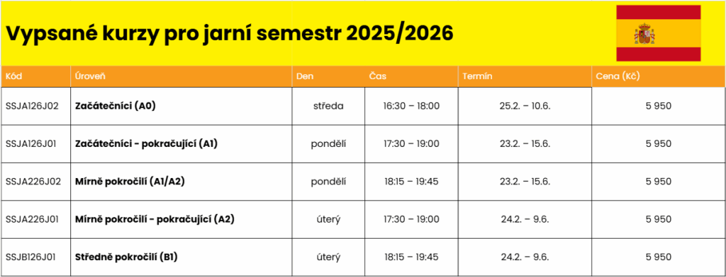 - Kurzy španělštiny u nás startují dvakrát ročně! Kurz se hradí za jeden semestr / 16 lekcí.