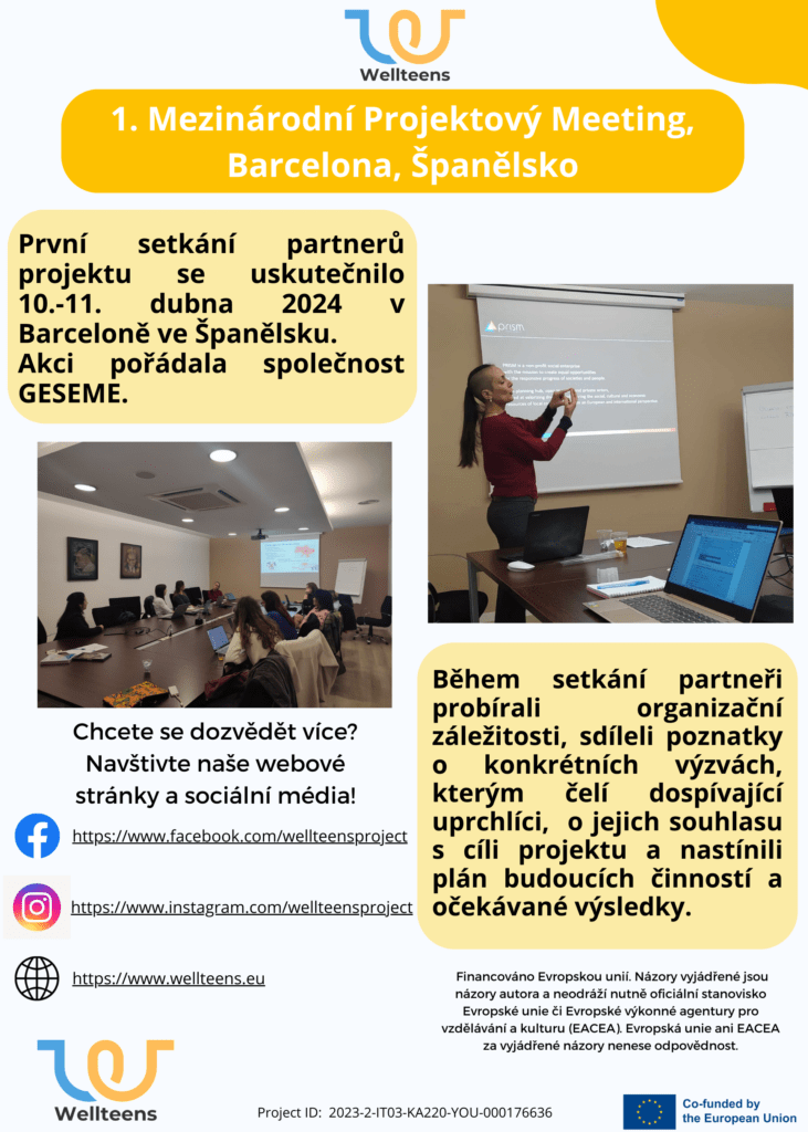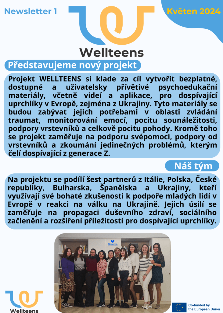 Projekt WELLTEENS, který začal v dubnu 2024, bude více jak dva roky pracovat na nástrojích pro psychologickou svépomoc. Tyto prostředky budou poskytovány sociálními pracovníky mladistvým uprchlíkům z Ukrajiny. Výstupy budou formou moderních technologií, která je velmi blízká Generaci Z.